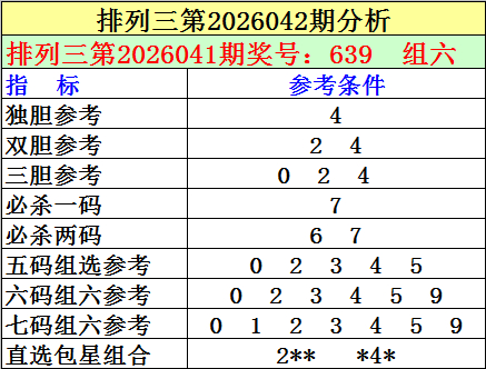 1.罗列三最近十期隔离开出号码:730-141-216-717-788-724-789-852-009-639,其中有8期奖号开出了上期的重叠号码,本期防重号轮空,排斥第2026041期奖号:639中的号码,温雅号码:4。
